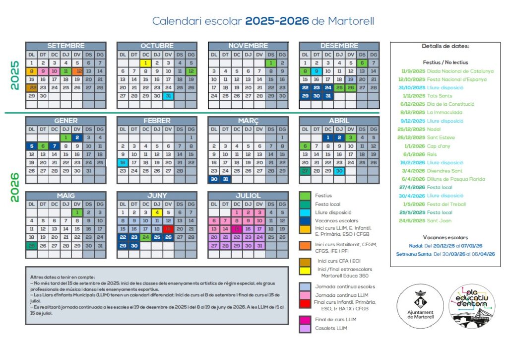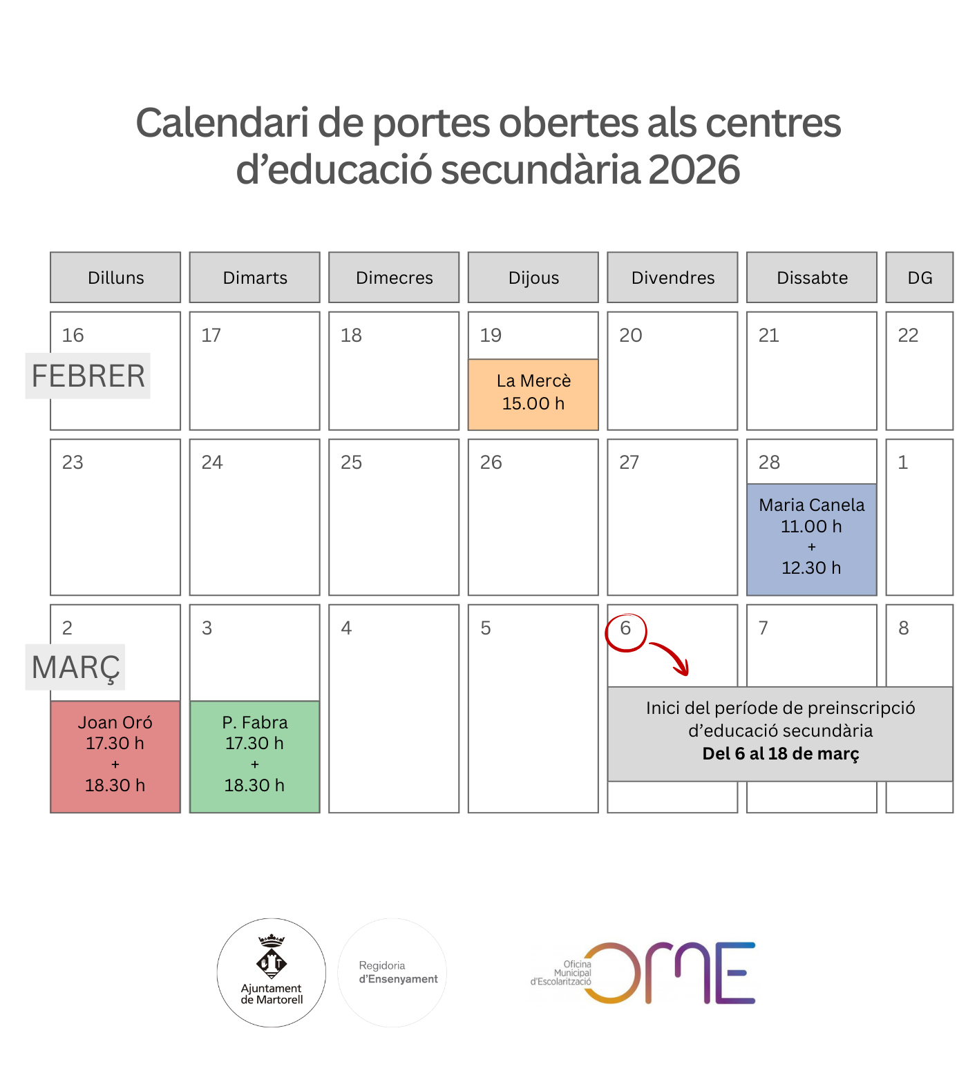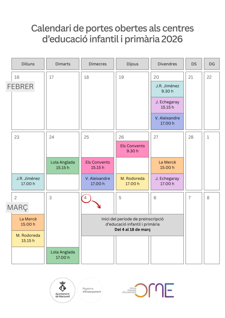 (1) Cita prèvia. Complex Educatiu. C/ Josep Tarradellas 11 baixos. Martorell. 937.752.538. Correu electrònic: ome@martorell.cat