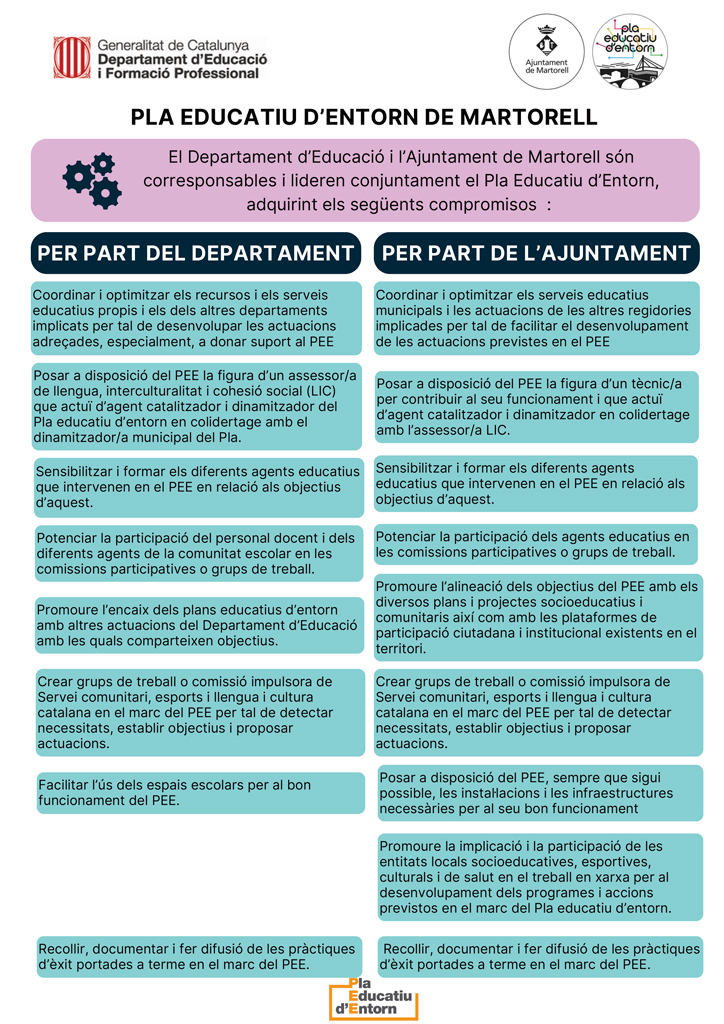 El Pla educatiu d’Entorn de Martorell és una proposta educativa innovadora entre el Departament d’Educació i l’Ajuntament de Martorell, per donar una resposta integrada i comunitària a les necessitats educatives del nostre territori.